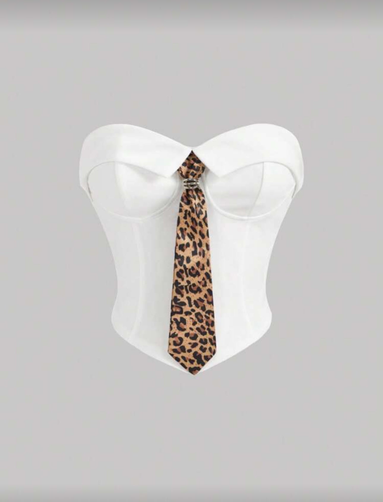 Combina elegancia clásica con un toque audaz en esta blusa sin mangas blanca adornada con una corbata de leopardo. El contraste entre el blanco puro y el patrón animal print crea un look sofisticado y moderno que destaca al instante. La corbata ajustable permite personalizar el fit y añade un elemento de estilo que transforma tu apariencia. Perfecta para quienes buscan expresar su personalidad con confianza, esta pieza versátil funciona tanto en ambientes profesionales como en salidas casuales con actitud.